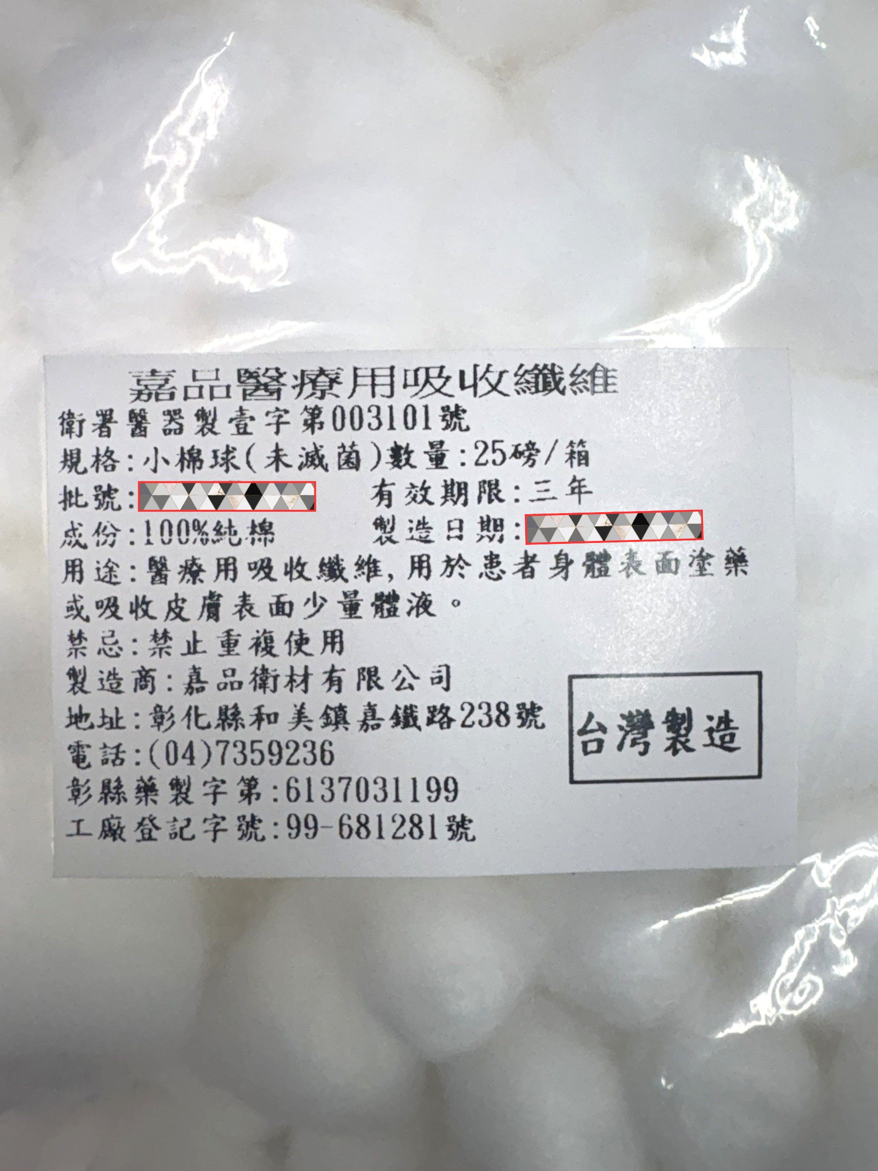 醫療器材品名:"嘉品" 醫療用吸收纖維 (未滅菌)