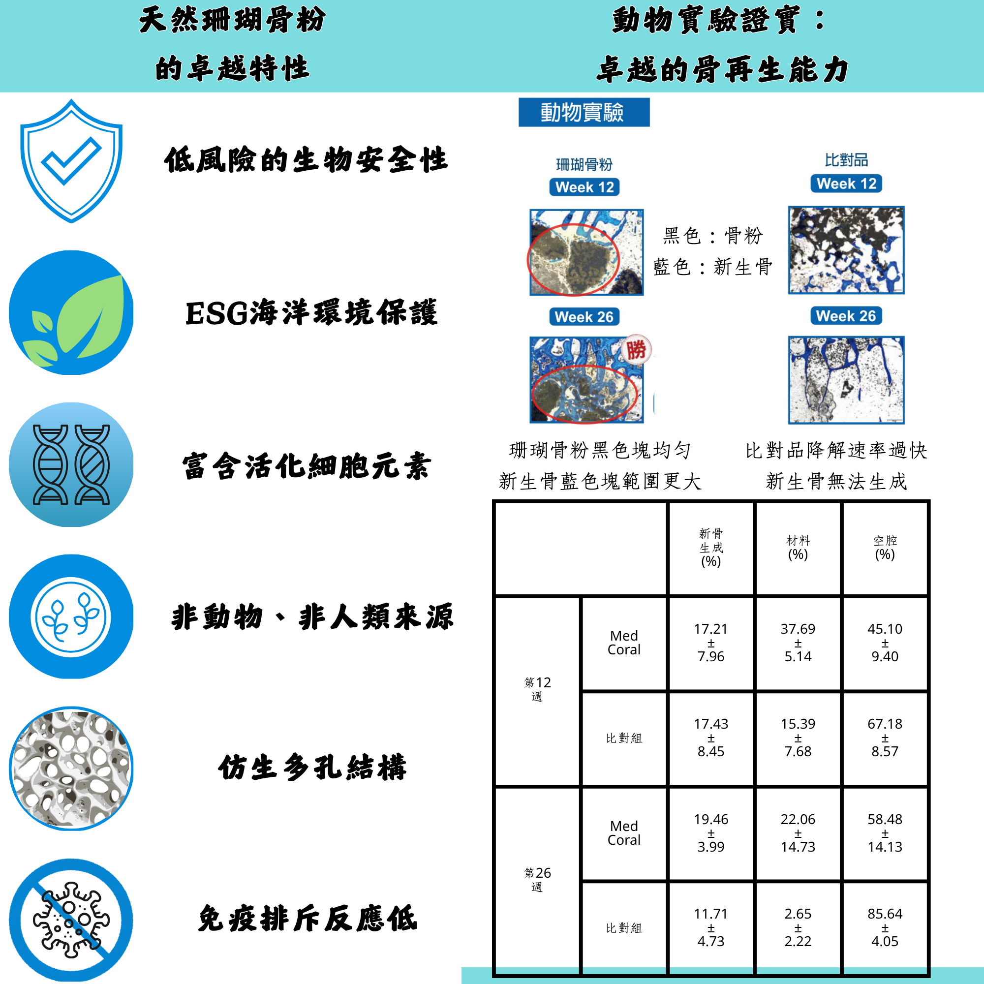 特殊天然微孔內聯通孔洞結構,具骨傳導性促使骨細胞向內生長,加速新生骨,生成架構與骨置互換性!